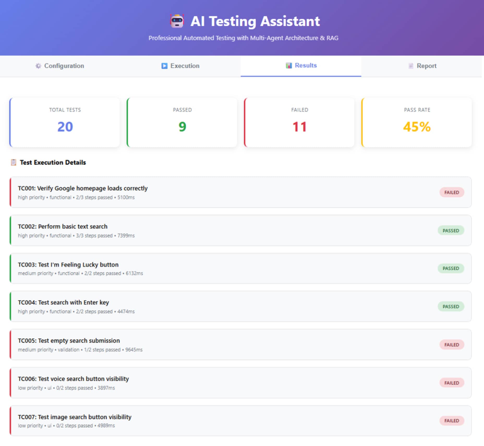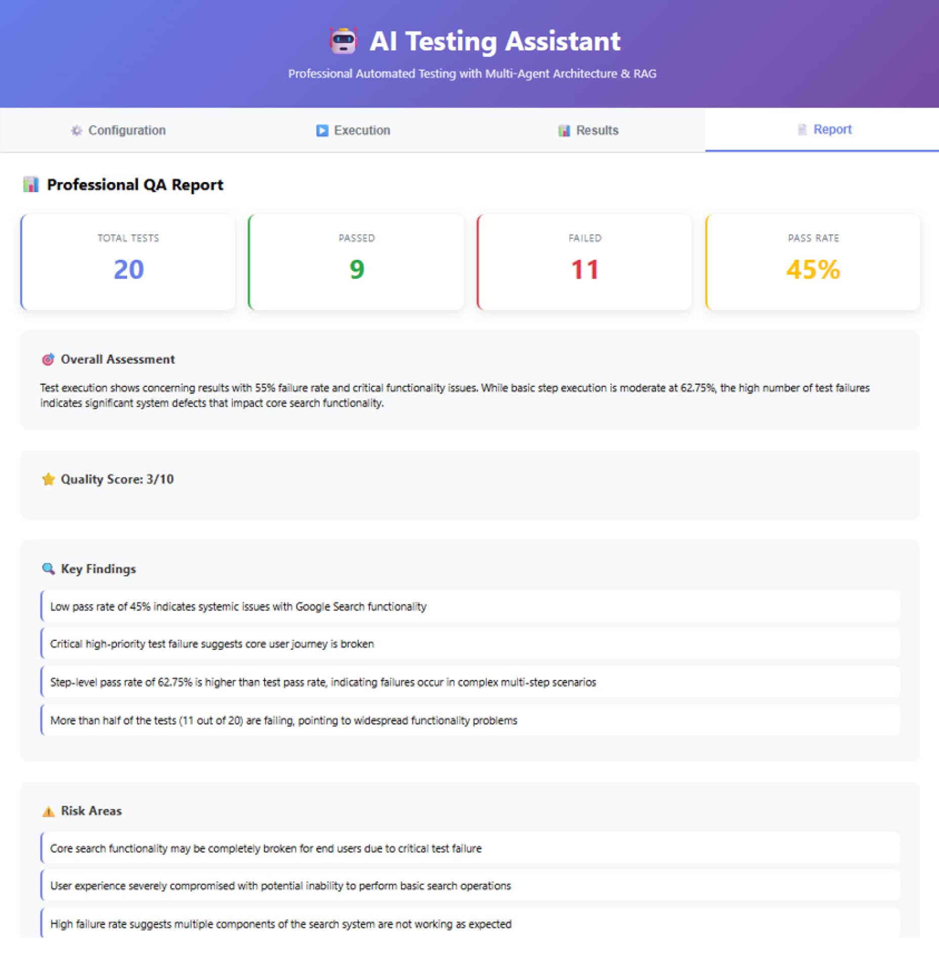 AI分析执行结果,识别出不仅仅是“通过/失败”的数字,而是深层的原因。例如,在一次实际测试中,系统得出了45%的通过率。虽然数字不高,但AI指出了核心问题:定位器(Selectors)受本地化影响严重。由于乌克兰语界面的元素属性与默认设置不同,导致了大量失败。